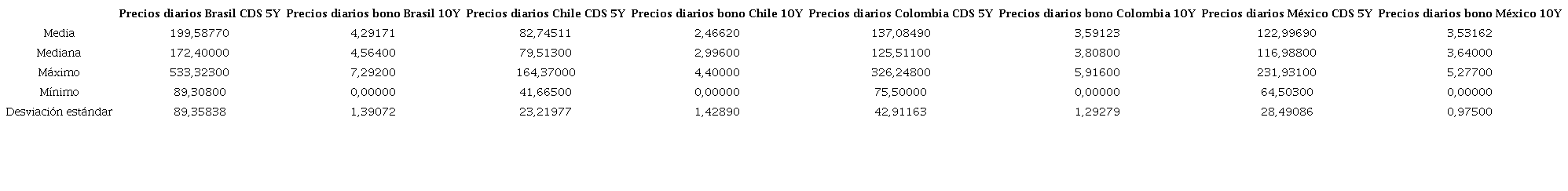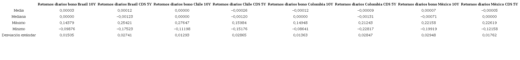 Asimismo, se obtuvieron los datos de estadística descriptiva para la muestra de precios diarios y sus retornos en el periodo analizado. En la tabla puede identificarse que, en los diferentes países, los precios diarios de los bonos son muy cercanos a su media, ya que tienen una volatilidad baja; mientras tanto, para el caso de los CDS, existe una volatilidad más alta, por lo que puede evidenciarse que los precios fluctúan, de modo que se alejan más de su valor medio.