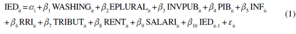 INVPUB: inversión pública real por sector económico como proporción del PIB real, como indicador del tamaño de intervención del Estado en el apoyo al desarrollo económico. Hay dos posibilidades del efecto que tendría la inversión pública sobre la IED: un efecto desplazamiento (crowding out) de la IED por el endeudamiento que implica la inversión pública, sea por incrementos en las tasas de interés local, aumento del déficit público, o por sustitución de las actividades donde se localiza la IED provocada por las nacionalizaciones o monopolios. Un efecto atracción (crowding in), que se genera a raíz de un aumento en la productividad del sector privado, si dicha inversión pública corresponde a la inversión orientada a infraestructura, carreteras y medios de transporte, proyectos de energía y educación, lo que hace que sea complementaria a la inversión privada.