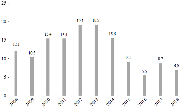 En el caso boliviano, el factor principal por el que la IED ha arribado al país, considerando los distintos motivos estratégicos que la guían, como la búsqueda de mercados, eficiencia, reducción de costos, seguridad jurídica, entre otros, ha sido la búsqueda de materias primas, cuya cotización se ha incrementado en la reciente década, lo que se refleja en mayor rentabilidad de la IED, principalmente en los sectores de hidrocarburos y minería. El comportamiento procíclico de la rentabilidad en Bolivia ha determinado que, en los años 2010 a 2013, esta haya llegado a una cima de 19,2 %, para luego caer hasta 6,9 % en 2018, como producto de la coyuntura negativa de los precios (Figura 4).