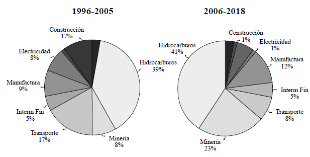 En cuanto a la participación de la IED en las actividades económicas, resalta el cambio de composición entre los periodos de evaluación, pues se pasó de una estructura diversificada entre 1996 y 2005, a una estructura más concentrada en algunos sectores entre 2006 y 2018 (Figura 5).