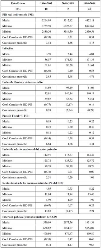 Existe una controversia del rol de la inversión pública sobre la privada, si existe complementariedad entre ambas, si son sustitutos o independientes. Existe la idea de que el gasto público productivo, está dirigido a la producción de bienes y servicios que el sector privado no produciría, por el incremento sustancial de sus costos o por los beneficios compartidos que ocasionaría su adquisición. La inversión pública puede tener un efecto indirecto sobre la formación de capital privado, lo que permite incrementar la demanda agregada de bienes y servicios producidos por el sector privado. También influye en las expectativas de los inversores privados sobre ventas y beneficios futuros (Hernández, 2010). En el MESCP, la presencia del Estado en la inversión agregada aumentó: entre 2006 y 2018 la inversión pública quintuplicó a la registrada en el periodo neoliberal. El crecimiento de la inversión pública en 1996-2005 fue 0,74 %, inferior al crecimiento registrado en 2006-2018, cuando llegó a 14,5 %. Esta variable, como apoyo a la inversión privada, tuvo efectos en la correlación con la IED que, en 1996-2018, llegó a 60 % (Tabla 3).