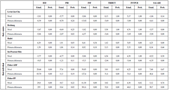 Para estimar los modelos, como primer paso, se requiere verificar la estacionariedad de las series de tiempo, para lo cual se realizaron pruebas de raíz unitaria común e individual11, para las variables en niveles y considerando ecuaciones con intercepto individual (Wooldridge, 2002).
