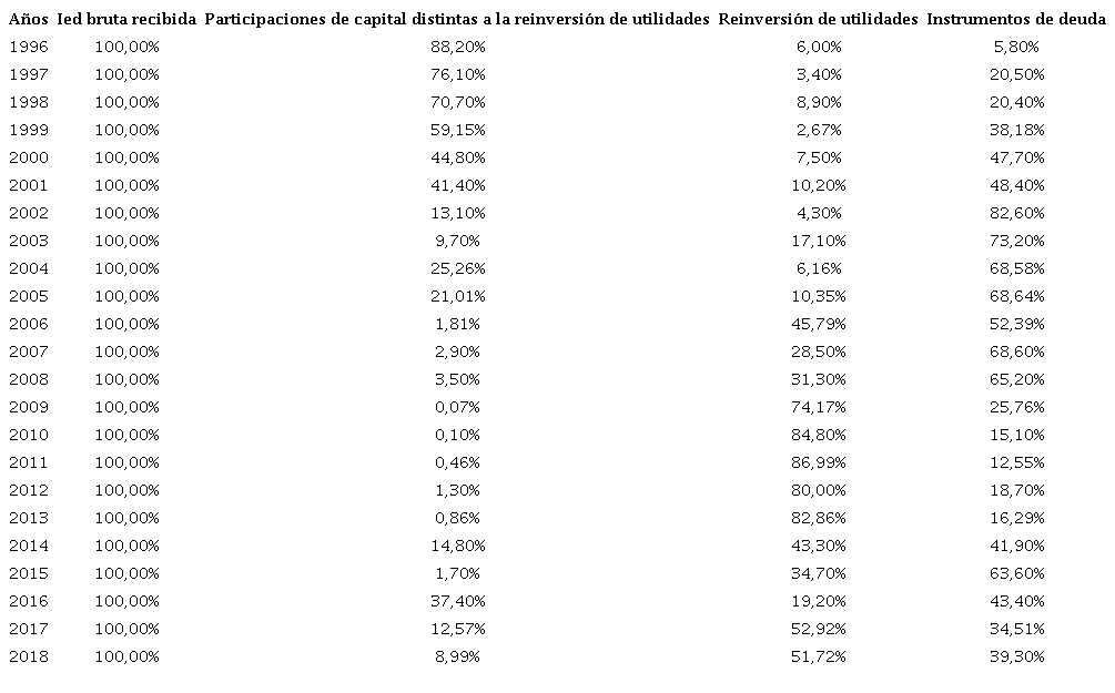 La inestabilidad de los flujos de IED también puede obtenerse al observar los cambios en su composición por modalidad. Mientras que, en 1996, el 88,2 % de IED ingresaba bajo la forma de acciones y otras participaciones de capital distintas a la reinversión de utilidades (frente a solo 5,8 % bajo instrumentos de deuda), a partir de 2002 solo el 13 % ingresaba como acciones y otras participaciones de capital, frente a un 82,6 % bajo la modalidad de instrumentos de deuda, como préstamos intrafirma y otros aportes (Tabla 1).