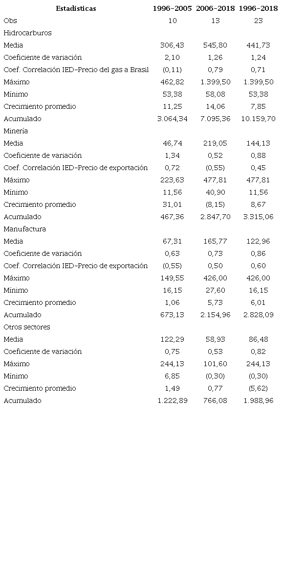 Entre 1996 y 2005, hidrocarburos acumuló IED bruta por 3064 millones de USD, con una desinversión de 872 millones y flujos netos por 2192 millones. En ese periodo, se tuvo un crecimiento promedio del 11,25 %, cuyo máximo alcanzó los 463 millones de USD en 2002, año después del cual, debido a los conflictos sociales y al contexto internacional adverso, se presentaron caídas recurrentes y significativas en los flujos. Después de 2005, pese al ambiente institucional adverso, la IED hacia hidrocarburos siguió incrementando de manera sostenida, con un crecimiento promedio de 14 % en 2006-2018, habiendo acumulado 7095 millones de USD (Tabla 2).