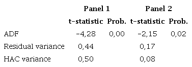 En la investigación, se verificó la presencia de raíz unitaria en las variables analizadas. Como se observa las series de tiempo, para los paneles 1 y 2, en su mayoría son I(1). Considerando los resultados de los dos test, se observa evidencia de una mezcla de órdenes de integración I(0) e I(1) (Tablas 4 y 5).