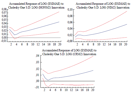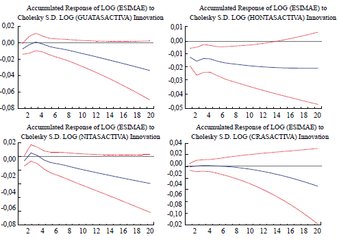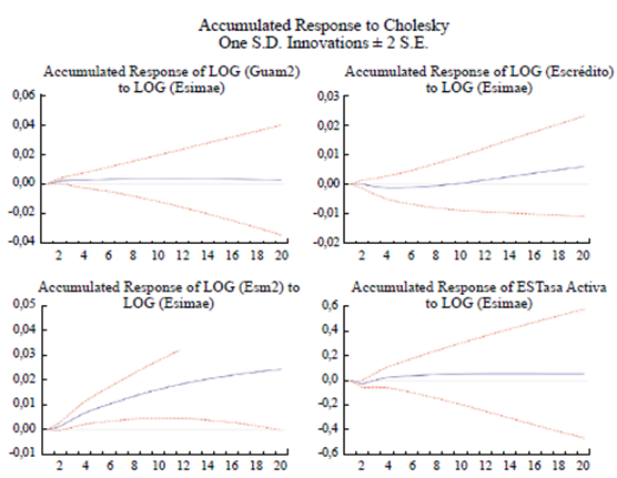 En la Figura 9, se observó que la respuesta del log(EsImae) ante el aumento de la tasa de interés bancario de El Salvador no era significativa. Sin embargo, su respuesta ante el aumento de la tasa activa de Guatemala es negativa en todo el periodo, y significativa a partir del décimo mes. La respuesta del log(Esimae) ante el aumento de la tasa de interés activa de Honduras también es negativa y significativa en los primeros catorce meses, mientras que su respuesta ante el aumento de la tasa activa de préstamos de Nicaragua es negativa y significativa después de diez meses. Por su parte, la respuesta de log(Esimae) ante el aumento de las tasa de interés de Costa Rica es negativa pero no significativa.