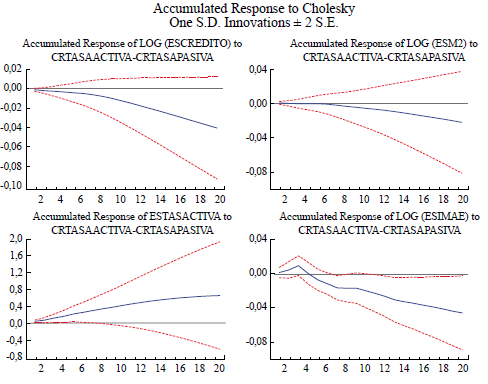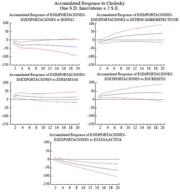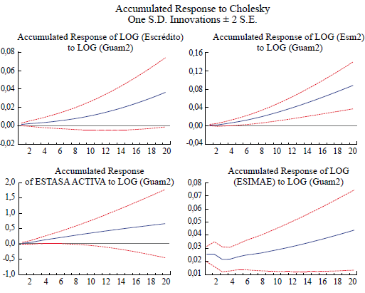 A continuación, se muestran las respuestas acumuladas de las distintas variables ante choques de una desviación estándar a las otras variables del VAR. La respuesta acumulada es la línea sólida que se encuentra en medio de las líneas quebradas que representan los intervalos de confianza de 95 %. La respuesta es significativa cuando las tres líneas se encuentran en un mismo cuadrante.