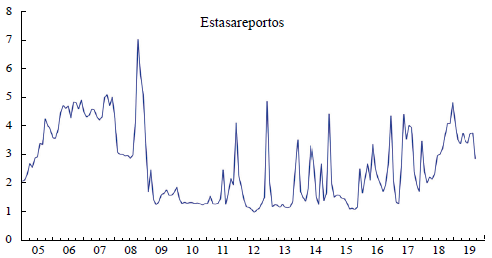 Por su parte, den Haan y Spear (1998) han presentado evidencia de que la volatilidad de la tasa de interés y el spread reflejan situaciones de "fricción" en el sistema bancario, asociadas con el racionamiento de recursos. La Figura 4 muestra que la tasa de reportos de El Salvador experimentó alta variabilidad después de 2008, hecho que revela una situación de racionamiento de recursos.