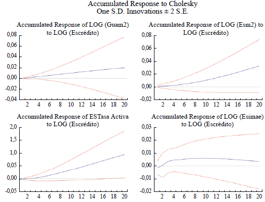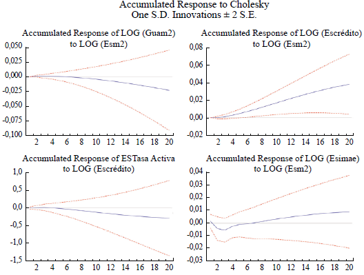 En la Figura 8, el crédito muestra una respuesta positiva y significativa en todo el periodo, ante el aumento de la oferta monetaria Esm2. La tasa de préstamos bancarios apenas responde al aumento del dinero y no es significativa. Esto evidencia que la tasa activa de préstamos está desvinculada de la oferta de dinero, lo que contradice los resultados encontrados en los estudios del modelo de transmisión.
