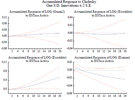 La tasa activa de préstamos muestra una respuesta positiva y significativa en los primeros ocho meses, lo que difiere de su respuesta no significativa ante el aumento de Esm2 (Figura 8).