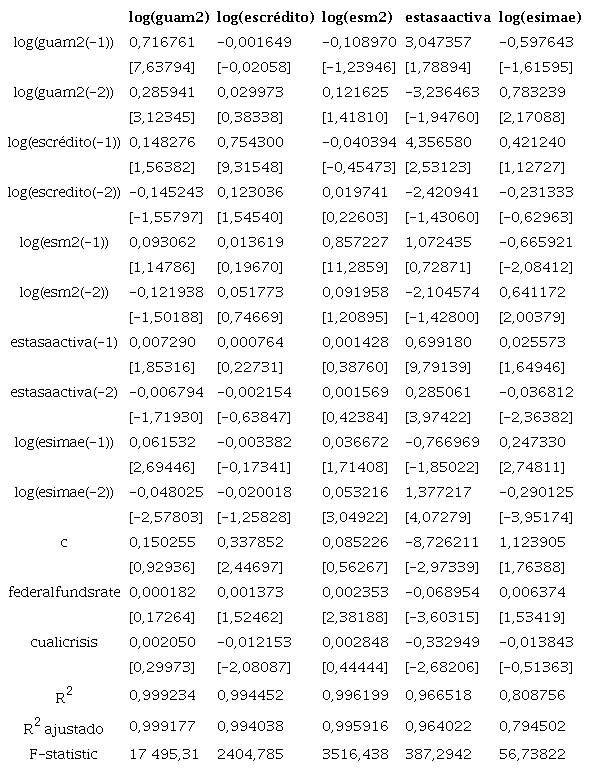 Por tanto, en el VAR la variable más exógena es la oferta monetaria de Guatemala (Guam2), seguida del crédito al sector privado (Escrédito), que también se considera exógena, dado que su oferta estaría influenciada por las políticas de las casas sedes de los bancos. A continuación, se incorpora en el VAR la oferta monetaria de El Salvador (Esm2), seguida de la tasa activa de préstamos bancarios (Estasa-activa). La variable más endógena en el índice mensual de actividad económica es el Esimae. Así, el VAR es el siguiente: (Guam2, Esm2, Escrédito, Estasaactiva, Esimae).