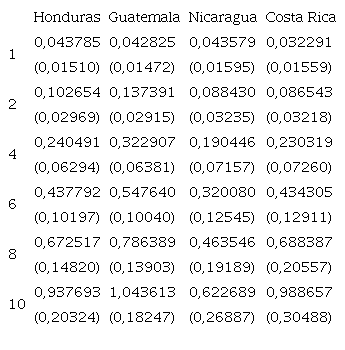 La Tabla 4 muestra las respuestas acumuladas de las tasas préstamos de El Salvador ante los aumentos de una desviación estándar en las tasas de interés bancarias de los otros países en el periodo de diez meses. Se observa que después de diez meses, la respuesta acumulada de la tasa activa de préstamos de El Salvador de mayor magnitud corresponde a su aumento ante el incremento de la tasa activa de Guatemala (1,0436), seguido de sus respuestas ante los aumentos en las tasas activas de Costa Rica (0,9887), Honduras (0,9377) y Nicaragua (0,6227). De este resultado, puede inferirse que El Salvador tiene la más intensa integración financiera con Guatemala, seguida de su integración financiera con Costa Rica, Honduras y Nicaragua. Este orden de intensidad refleja, en cierto grado, el orden de los montos de exportaciones de El Salvador a estos países6.