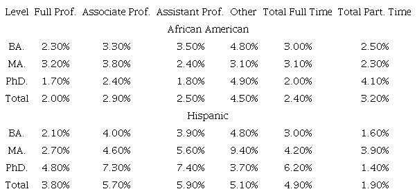 Additionally, 26% of African American and 24% of Hispanic respondents reported having suffered personal experiences of unfair treatment in promotion decisions in academia compared to 15% of white respondents, and there was a frequent reference to elitism in economics: There is a sense that the NBER, the AEA, and the top journals are controlled by economists from the top institutions. There is evidence that the obstacles for Hispanics and African Americans to access and success in the economics discipline go beyond the institutional structure and have become embedded in the imagination not only of the discriminators but also in the minds of many of those who are discriminated against.