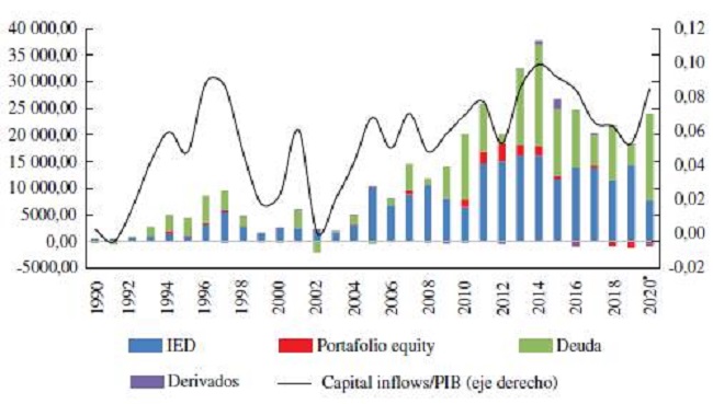 Con la aplicación del "QE infinito" en la crisis actual, los flujos de capital que en un primer momento se contrajeron intensamente, han retornado sobre la base de un incremento sin precedentes de la liquidez mundial, en búsqueda de una mayor tasa de lucro en activos riesgosos de corto plazo (Bortz et al., 2020; Vernengo y Nabar-Bhaduri, 2020). En efecto, como se muestra en el caso colombiano, en lo que respecta a capital inflows, en el segundo trimestre de 2020, los flujos de IED cayeron 68 %, comparado con el mismo periodo de 2019; mientras los flujos de deuda crecieron 414 %. Por su parte los flujos de portafolio (equity) y derivados incrementaron 41 % y 50 %, respectivamente. En total los capital inflows crecieron 19 %, pasando de 4760 millones a 5666 millones de USD.