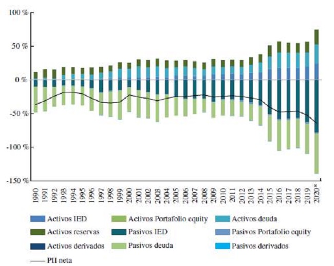 Con el rápido crecimiento de los balances externos, la renta primaria de las inversiones asociadas a los pasivos y activos se vuelve más significativa, en comparación con los ingresos obtenidos por la balanza de bienes y servicios dentro de la cuenta corriente (Figura 2), lo que deteriora la posición neta en la PII (Figura 3). A su vez, la ampliación de los balances externos ha vuelto más vulnerable a las economías periféricas, como la colombiana, ante los cambios en las condiciones financieras internacionales y movimiento de las tasas de interés de los países centrales, que alteran los precios de los activos financieros y las tasas de cambio, no solo a través de impactos en los flujos de capital, sino también al alterar el valor de los stocks de activos y pasivos brutos, así como las posiciones netas de las rentas de la inversión (Akyüz, 2021; UNCTAD, 2019).