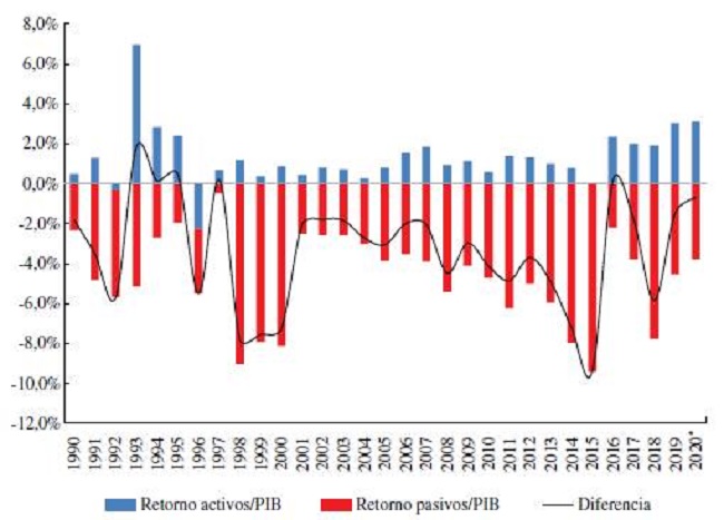 El diferencial entre las tasas de interés, la dinámica de la tasa de cambio y las diferencias entre los tamaños y composiciones de los activos y pasivos implican una transferencia de riqueza financiera de los países periféricos a los países centrales. Al aplicar la metodología propuesta por Akyüz (2021)5, para el caso colombiano, en el periodo 1990-2020, se encuentra que el retorno sobre los activos fue de 4,62 % mientras el retorno de los pasivos fue de 8,02 %, lo que corresponde a una diferencia promedio de -3,4 %. En el periodo precrisis (1990-2007), se tiene que esta diferencia fue de -2,75 % y en el periodo posterior (2008-2020) fue de -4,32 %.