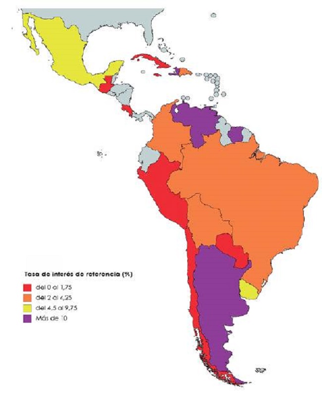 Como puede observarse en la Figura 1, unos países mantienen más margen que otros para seguir gestionando la política de tipo de interés, hasta aproximarse a cero. El Banco Central de Brasil ha recortado varias veces la tasa básica en este episodio epidémico hasta alcanzar el 2 %; igual que el Banco de la República de Colombia. El Banco de México lleva también una serie de rebajas, hasta fijar la tasa en 4,5 %. Por su parte, el Banco Central de Chile tiene un tipo de interés del 0,5 %, mientras que el Banco Central de la República Argentina lo ha bajado de 65 % a 38 %, por lo que es la entidad del mundo que más ha bajado su tasa de referencia en respuesta al shock del COVID-19.