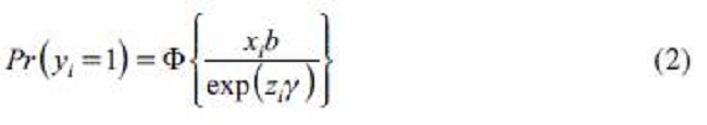 Donde y¡ , i = 1,2,..., N, es el resultado binario del estado de la operación de las empresas, tomando valor 1 si la empresa i manifiesta suspender-cerrar su actividad productiva; y cero en caso contrario; x¡ es la combinación lineal de las variables regresoras; y Φ es la función de distribución acumulada (CDF, por sus siglas en inglés) normal, con varianza en función de las regresoras heterocedásticas.