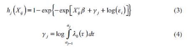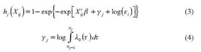 Sea una muestra de empresas que entra a cese de actividades en un mes j determinado. A continuación, denótese con h¡j la tasa de riesgo mensual discreta de la empresa ¡ en el mes j. Sea Xu un vector de covariantes entre los cuales están los periodos que lleva en el mercado, si tiene cartera de clientes que le permita apalancarse una serie de periodos, si tiene sucursales y si es una microempresa. La tasa de riesgo mensual discreta vendrá dada por las ecuaciones (3) y (4).