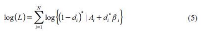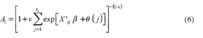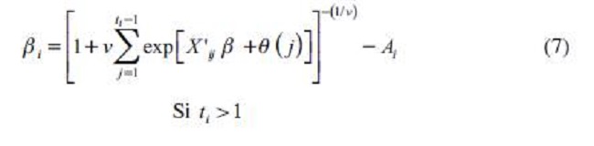 Donde e¡ sigue una distribución gamma, con media unitaria y varianza σ2 = v; y 7 j es el logaritmo de la integral del riesgo básico sobre el intervalo relevante αj . La función de verosimilitud en logaritmos tiene la expresión (5).