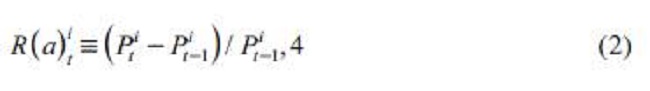 Donde R (a)tt es el rendimiento de la acción i en el período t (en el tiempo t-1 al tiempo t); P¡t , es el precio de la acción i en el tiempo t; y Pt-1i , es el precio de la acción i en el tiempo t-1.