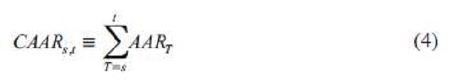 En caso de buenas noticas, los AAR tienen mayor tendencia a ser positivos, así que los CAAR deberían revelar una irregularidad al alza. Para las noticias malas, los AAR tienden a ser negativos y, por consiguiente, calcular los CAAR debería revelar una irregularidad a la baja. En la ecuación (4), se muestra la representación matemática de los CAAR.