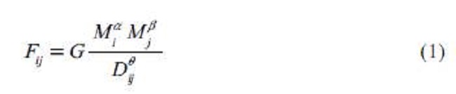son los tamaños económicos de las dos localidades; si se mide el comercio mediante F, entonces las masas corresponderán al PIB o el producto nacional bruto (PNB). Dij es la distancia entre los lugares y, usualmente, se mide de centro a centro.