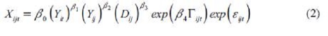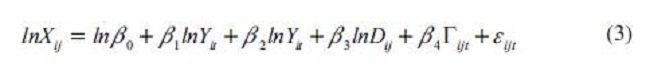 Donde Xijt es el comercio entre los países i y j en el año t; Yij es el producto (o producto per cápita) de los países i y j en el año t; Dij es la distancia entre el país i y el país j; Γijt es un vector de variables explicativas adicionales (barreras físicas y condiciones de política); y εijt es el error, normalmente distribuido, con media cero.
