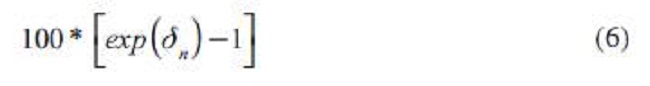 Los coeficientes representados por βn se interpretan como una variación porcentual; y para interpretar los coeficientes de variables binarias representados por δn se calcula la diferencia porcentual exacta en Ltrade¡jt predicha para cuando la variable dummy toma como valor 1 frente a cuando su valor es 0.