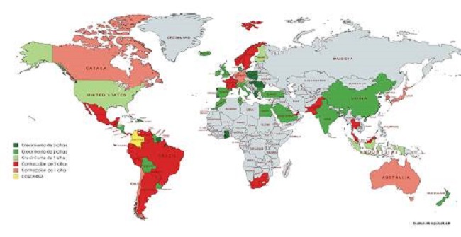 La Figura 2 asigna diferentes tonalidades de verde a los países cuyas importaciones crecieron; la intensidad denota mayor crecimiento promedio. Para los países en rojo, su color acentuado refleja mayor contracción promedio en las importaciones.