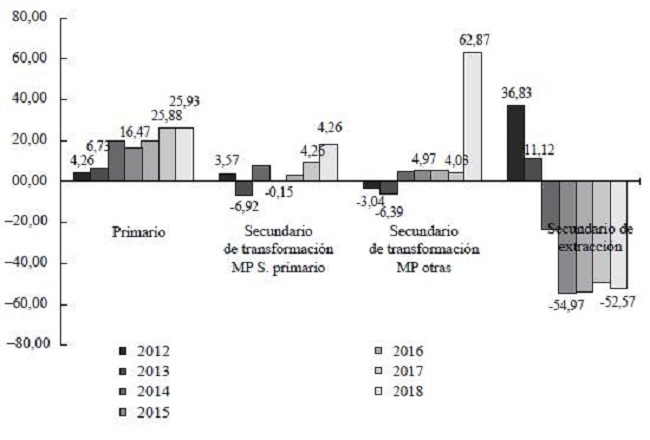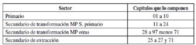 Los 95 capítulos arancelarios fueron clasificados en dos sectores: el primario y el secundario. Este último, a su vez, se dividió en tres subsectores: (1) el secundario de transformación de materias primas pertenecientes al sector primario, (2) el secundario de transformación de otras materias primas y (3) el secundario de extracción.