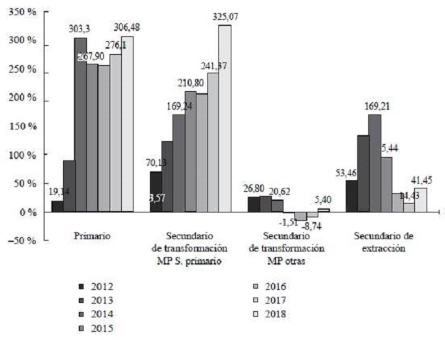 Según el informe de monitoreo y evaluación de política agrícola para Colombia (OCDE, 2019, pp. 200-204), el apoyo dominante que recibe el productor del sector primario viene del mercado. Dado que los precios de la materia prima son más altos en el mercado local y que la capacidad de producción de Estados Unidos es mayor, el valor agregado extranjero de las exportaciones colombianas está compuesto en mayor medida por materia prima proveniente de Estados Unidos (Trade in Value Added, 2015). Sin embargo, el destino final de estas no es Estados Unidos, ya que las exportaciones colombianas de transformaciones de materias primas del sector primario solo crecieron 0,34 veces, y de otras materias primas creció 0,72 veces.