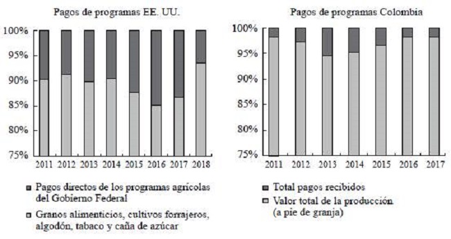 Por otra parte, los auxilios económicos percibidos por el sector son un factor diferencial. Para promover y apoyar el desarrollo del sector primario el Gobierno de Estados Unidos gira pagos anualmente a través de más de dieciocho programas agrícolas; los cuatro principales cubren el 79 % de estos pagos, destinados a la cobertura de riesgo agrícola, conservación, asistencia de desastres y pagos fijos. Estos desembolsos han cubierto desde el 10 % hasta el 17 % (2011-2018) de los ingresos por cultivo de granos alimenticios, cultivos forrajeros, algodón, tabaco y caña de azúcar (estos son los principales artículos beneficiarios según el informe del Departamento de Agricultura a la OMC, 2016).