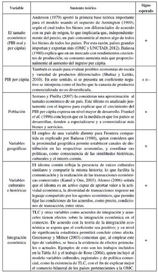 Agregado a lo anterior, aunque existan políticas para la reducción de las barreras arancelarias, factores como la distancia y el tamaño de las economías de los países también incentivan el comercio entre estos, como observó Tinbergen (1962), quien se basó en el modelo de la gravitación universal de Newton para construir el modelo gravitacional del comercio. Este instrumento empírico es ampliamente reconocido debido a su extraordinaria estabilidad y su poder para explicar los flujos comerciales entre países (OMC y UNCTAD, 2012). En su versión corriente, el modelo explica los flujos de comercio entre dos países en función de sus tamaños, medidos a través de la población, el producto interno bruto (PIB) y la distancia que los separa (Cárdenas y García, 2005).