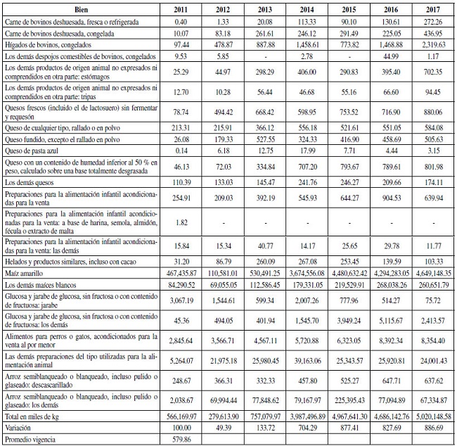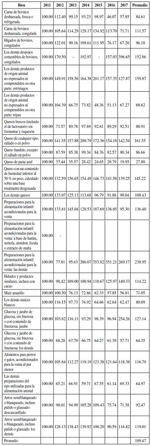 El cálculo de la creación de comercio para los contingentes arancelarios arroja que el comercio generado por Estados Unidos, en 2012-2017, equivale en promedio a 580 % de las importaciones de estos durante 2011. Es decir, la reducción de los aranceles para estos artículos aumentó las importaciones desde Estados Unidos en casi seis veces, según su unidad de medida en kilos. Durante el mismo periodo, se observa que los precios de los artículos aumentaron 9 % en promedio, en comparación con sus precios en 2011 (Tablas A2 y A3).