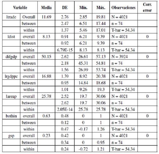 Para la estimación del modelo se empleó el software estadístico Stata. Como se mencionó en la sección de datos, los faltantes de información en los primeros años de la muestra hacen que el panel no esté balanceado. Sin embargo, Stata permite trabajar cómodamente con cualquier conjunto de datos panel, balanceados o no balanceados (Baum, 2006, p. 47). En todo caso, es importante aclarar que los datos faltantes no se correlacionan con algún factor inobservable que influya en la suspensión del comercio entre los países, por tanto, la selección muestral no causa estimadores insesgados.