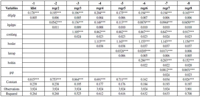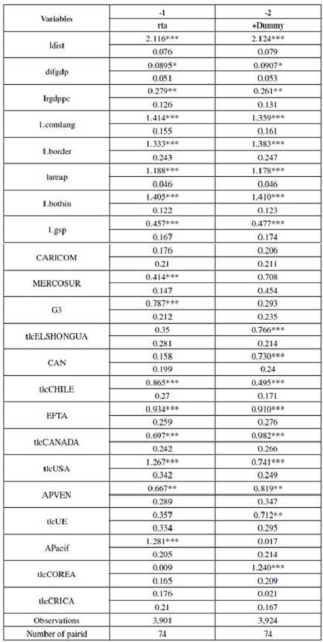 Finalmente, se eligió el modelo panel descrito en la fórmula (4) que usa efectos fijos para contrarrestar la endogeneidad y controlar la interacción transversal y temporal, y errores robustos al clúster de par de países, que asume una varianza del error constante.