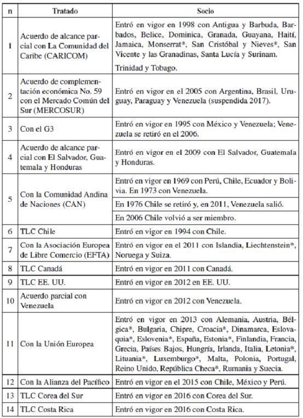 rta¡jt es una variable categórica que puede tomar valores de 0 a 14. Cada valor corresponde a un tratado comercial vigente de Colombia (aunque hay diferentes formas de integración comercial se usará "tratado comercial" como un descriptor genérico). Toma el valor n si el socio con el que comercia Colombia en el año t forma parte del tratado suscrito con el país (Tabla 2).