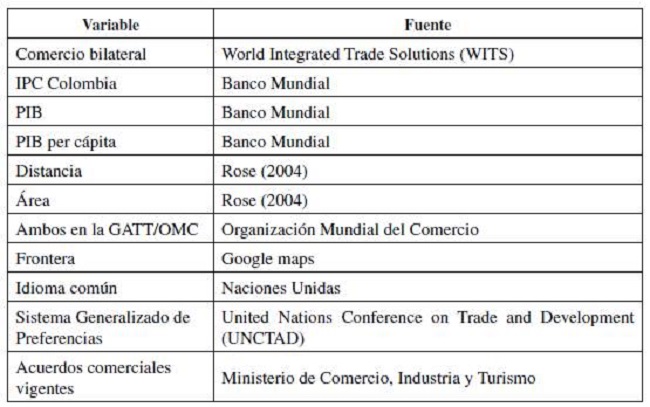 En la revisión del estado del arte del modelo gravitacional de comercio, se identificaron dos tipos de bases de datos usadas para determinar los efectos de un TLC sobre el comercio. El primero utiliza el comercio bilateral como un promedio de importaciones y exportaciones entre los socios o alguno de estos flujos (importaciones o exportaciones); son estimados por mínimos cuadrados ordinarios (MCO) (Cárdenas y García, 2005; Rahman y Dutta, 2012; Rose, 2004), panel de datos, en algunos casos con efectos aleatorios (Abedini y Peridy, 2008; Baier y Bergs-trad, 2006; Peridy, 2005) y otros con efectos fijos (Institute for International Trade, 2015; Sally y Siddique, 2014). En el segundo grupo, que analiza el comercio desde la perspectiva del importador y del exportador, los autores coinciden en el uso de efectos fijos independientes para el importador y el exportador (Carrere, 2006; Dutt et al., 2013; Eicher y Henn, 2011; Gil-Pareja et al., 2016; Roy y Rayhan, 2011) y, recientemente, se adopta un estimador Poisson de máxima verosimilitud (Esteve et al., 2019; Martin y Pham, 2019; Santos y Tenreyro, 2006; Timsina y Culas, 2019).
