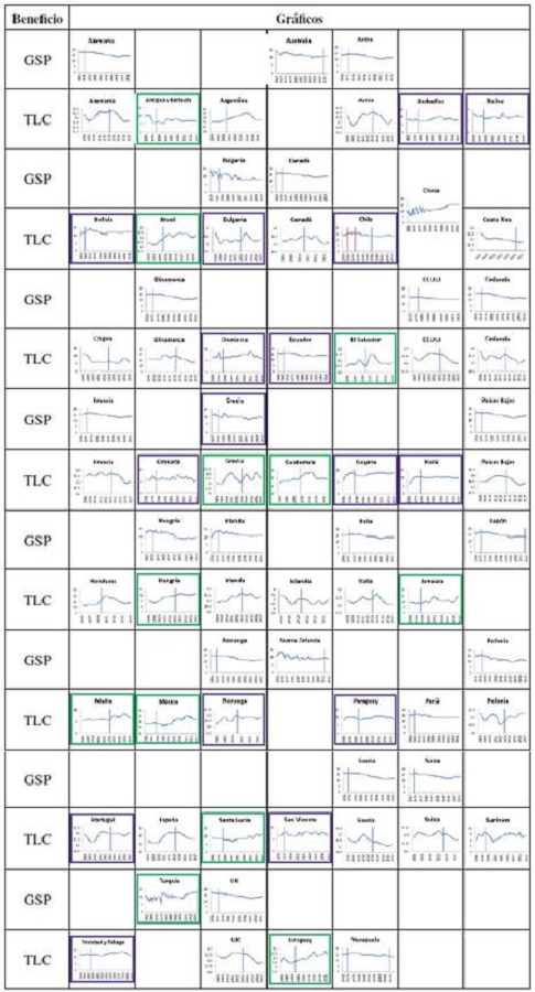 De las 21 gráficas que representan el comercio bajo GSP, solo una muestra aumento después de la fecha de entrada en vigor (con borde color verde, correspondiente a Turquía); otra unidad muestra un comportamiento constante del comercio (color morado, correspondiente a Grecia). Cincuenta gráficas muestran el comportamiento del comercio entre Colombia y el socio comercial bajo TLC. Trece de estas muestran aumento (también en color verde, corresponden a Antigua y Barbuda, Argentina, Brasil, El Salvador, Grecia, Guatemala, Hungría, Jamaica, Malta, México, Polonia, Santa Lucía y Uruguay); quince muestran flujos constantes; y veintidós, disminución del comercio bilateral a partir de su entrada en vigor.