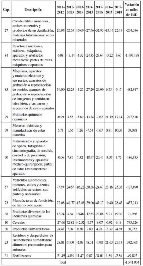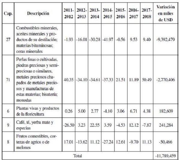 Comparando las pérdidas por disminución de las exportaciones según los capítulos analizados, Colombia fue el país que resultó más perjudicado. Ello se debe a que, de 2011 a 2018, sus exportaciones cayeron en 11,8 mil millones de USD y para Estados Unidos las pérdidas ascienden a USD 1,5 mil millones.