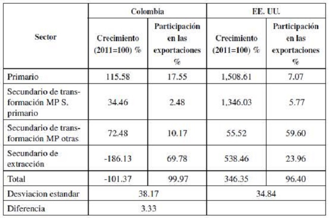 Según la intensidad del comercio, las exportaciones de Colombia están fuertemente concentradas en el petróleo y otros minerales, mientras que las propias de Estados Unidos lo están en el sector secundario de transformación de otras materias primas diferentes a las provenientes del sector primario (los principales capítulos están detallados en la Tabla 6). Los porcentajes de participación de los sectores en las exportaciones presentan mayor desviación estándar para Colombia y la diferencia de puntos porcentuales ocurre entre el primer y segundo sector con mayor participación de 42,5, mientras para Estados Unidos esta diferencia es de 36 puntos porcentuales. Esta marcada concentración para Colombia, expone al país a desequilibrios económicos sujetos al precio del petróleo.