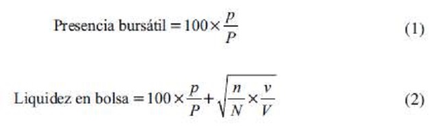 Con respecto a las firmas que forman parte de los portafolios benchmark de cada mercado, se usaron los siguientes criterios: en Brasil, las firmas cotizantes en bolsa con presencia bursátil mayor a 95 % (ecuación 1) y ordenadas por capitalización bursátil de final de cada trimestre en forma decreciente. En Chile, las firmas con mayor presencia bursátil al final de cada trimestre en orden decreciente. En México, las firmas con presencia bursátil mayor a 95 %, ordenadas en forma decreciente por el indicador de liquidez en bolsa de EconomáticaTM al final de cada trimestre, dada por la ecuación (2). Finalmente, para Perú, se seleccionaron las firmas con mayor presencia bursátil en orden decreciente. Es posible notar que tanto los portafolios a evaluar su desempeño como los portafolios benchmark de cada mercado, se reformulan trimestre a trimestre, con base en los criterios mencionados.