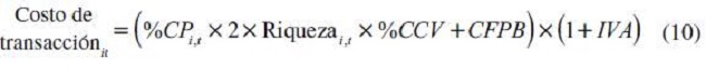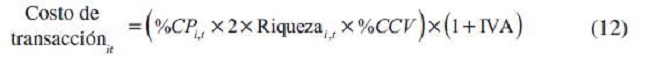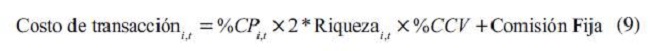 Por otra parte, los costos de transacción son definidos de forma distinta para cada mercado accionario (ecuaciones 9-12). Se consideró dos veces el monto comprado de acciones pues, si se compra, por ejemplo, el 30 % del portafolio de un trimestre a otro, es necesario vender ese 30 %.
