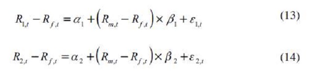 Los modelos econométricos que se utilizan para estimar de manera conjunta el alfa de Jensen y los riesgos sistemáticos son los de mínimos cuadrados ordinarios (MCO) y regresiones aparentemente no relacionadas (SUR), este último para controlar la posible correlación de los residuos entre los portafolios de buen y mal uso del endeudamiento. La aplicación de cada uno de los métodos será testeada más adelante. El sistema de ecuaciones para el caso de Brasil está dado por las ecuaciones (13) y (14):