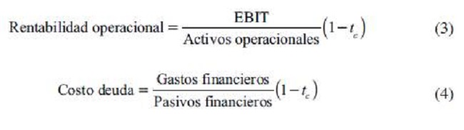 Primero, fue necesario determinar cómo utilizaron el endeudamiento las firmas para financiar sus activos de operación. Para ello, se calculó un indicador de rentabilidad operacional definido como Earnings Before Interest and Taxes (EBIT) sobre los activos operacionales de la empresa (ecuación 3). Luego, se calculó el costo de la deuda definido en este estudio por los gastos financieros sobre los pasivos financieros de las firmas, ambos indicadores después de impuestos corporativos (tc;ecuación 4).