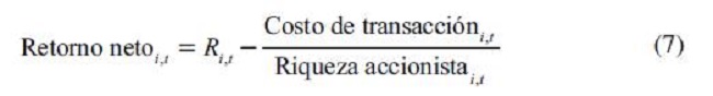 Estos costos de comisión de los brokers en cada mercado accionario serán definidos con base en Maringer (2005) como una mezcla de costos fijos y costos proporcionales, descontados al retorno bruto de los portafolios de buen o mal uso del endeudamiento y del portafolio benchmark de mercado construido para cada país, respectivamente. El retorno neto al igual que De Greiff y Rivera (2018) reduce la rentabilidad del portafolio (ecuación 7). Conviene recordar que i = 1 corresponde al portafolio de buen uso del endeudamiento, i = 2 de mal uso e i = 3 al portafolio benchmark de mercado construido. Esta ecuación se replica para los cuatro mercados accionarios.