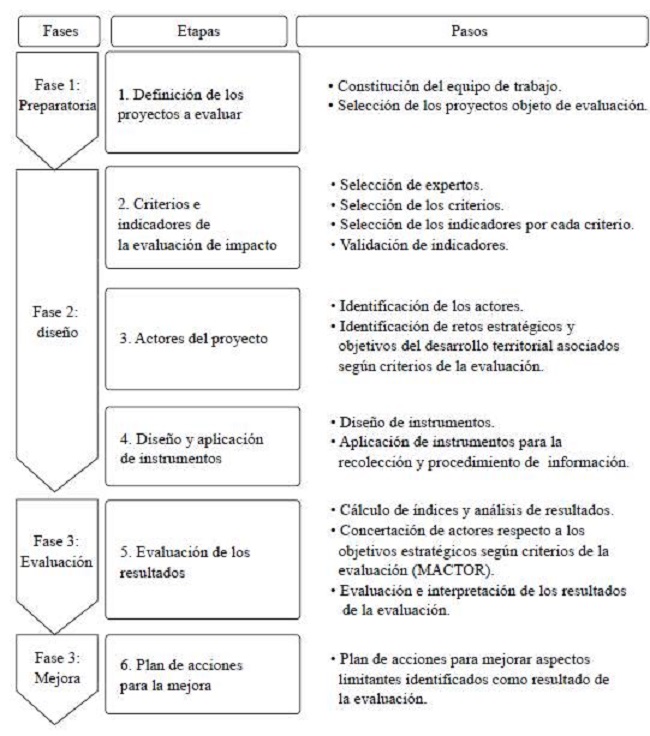Para cumplir con el objetivo, se diseñó una metodología estructurada en fases y etapas, que integran los criterios de impacto, pertinencia, eficiencia, eficacia, sos-tenibilidad y el análisis de la concertación de actores. Todo ello, se hizo para poder evaluar con integralidad y rigor científico la percepción del impacto de los proyectos de desarrollo local de tipo económico en el desarrollo territorial de la provincia Cienfuegos, desde la perspectiva de los actores involucrados, considerando retos y objetivos estratégicos asociados.