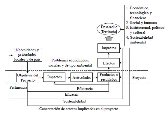 Los criterios escogidos para la evaluación se integraron a la cadena de resultados del proyecto, según la lógica de la metodología de marco lógico. Ello significa que estaría determinándose con qué eficacia y eficiencia se logran los resultados del proyecto, sus efectos e impactos identificados, su pertinencia y sostenibilidad. Esto cobra sentido si se tiene en cuenta la concertación de los actores implicados con el proyecto en el logro de los objetivos estratégicos del desarrollo territorial, según criterios de la evaluación de impacto, como un elemento clave para lograr el éxito de los proyectos y, con ello, los efectos que contribuyen, en efecto, a los cambios y transformaciones que expresan desarrollo, según dimensiones de análisis.