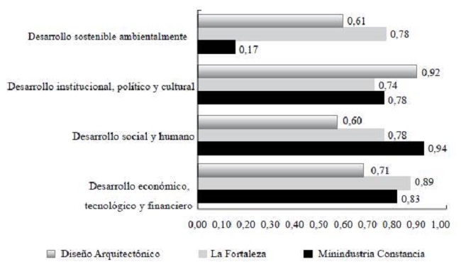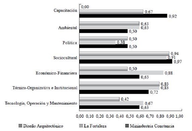 Con respecto al criterio de sostenibilidad, la Figura 4 explica el comportamiento en las dimensiones de tecnología, operación y mantenimiento; técnico-organizativa e institucional; económico-financiera, sociocultural; política; ambiental y capacitación; según valores de los índices relativos por dimensiones del criterio sostenibilidad (IRSD) de cada una para los tres proyectos. Ello determina los valores medios, en los tres casos, del índice relativo de sostenibilidad (IRS): 0,75 para la Minindustria; 0,77 para la Fortaleza y 0,65 en el caso de Diseño Arquitectónico (Tabla 1).